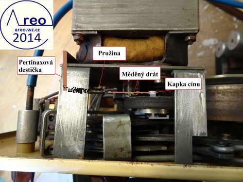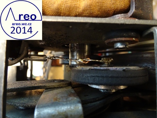 U magnetofonu MGK10 se může stát, že přestože bude v pořádku gumové obložení, tak bude gumové kolečko prokluzovat na ose motorku. Problémem je malá třecí plocha na rychlosti 9. Pokud se gumové obložení na kolečku pro rychlost 19 nerozpadá, tak lze většinou ještě použít, poněvadž se tře o osu motorku s větším průměrem. Gumové obložení pro rychlost 9 však musí být v perfektním měkkém stavu. U mého kusu bylo dokonce rozpadlé. Poněvadž byla původní guma přilepena nějakým nevhodným lepidlem, tak kousky bývalé gumy opadaly na některých částech i s kousky hliníkového kolečka :-). Nejlepším řešením je samozřejmě takové kolečko znovu vysoustružit a použít, či vyrobit, gumový kroužek přesně pro něj. Jednodušším řešením je použití dvou gumových vodovodních těsnění a jejich přilepením k sobě i ke kolečku. Kolečko je většinou třeba přitlačovat k ose motoru kvůli nedostatečnému průměru, poněvadž po zbroušení na kolečku nezbyde dost materiálu. Ovšem jemně, aby se po delším skladování magnetofonu do gumy nevytlačila drážka. Velikou výhodou je to, že je na téměř všechny kovové části možné pájet. Stačí tedy napájet na osu kolečka měděný drátek, jenž se napojuje na středně jemnou pružinku zaháknutou za pertinaxovou destičku s vývody z motoru. Do destičky je vhodné vyvrtat asi 0,5mm dírku a poté délkou měděného drátku vyladit tah. Nakonec je většinou nutné obrousit gumové obložení kolečka. Například použitím ruční frézky s brusným nástavcem za běhu magnetofonu. Všechny úpravy lze provést bez rozebrání čehokoli, kromě vyjmutí mechaniky z krabice. Magnetofon již takto funguje dva roky. Podrobnější obrázky jsou dole.
