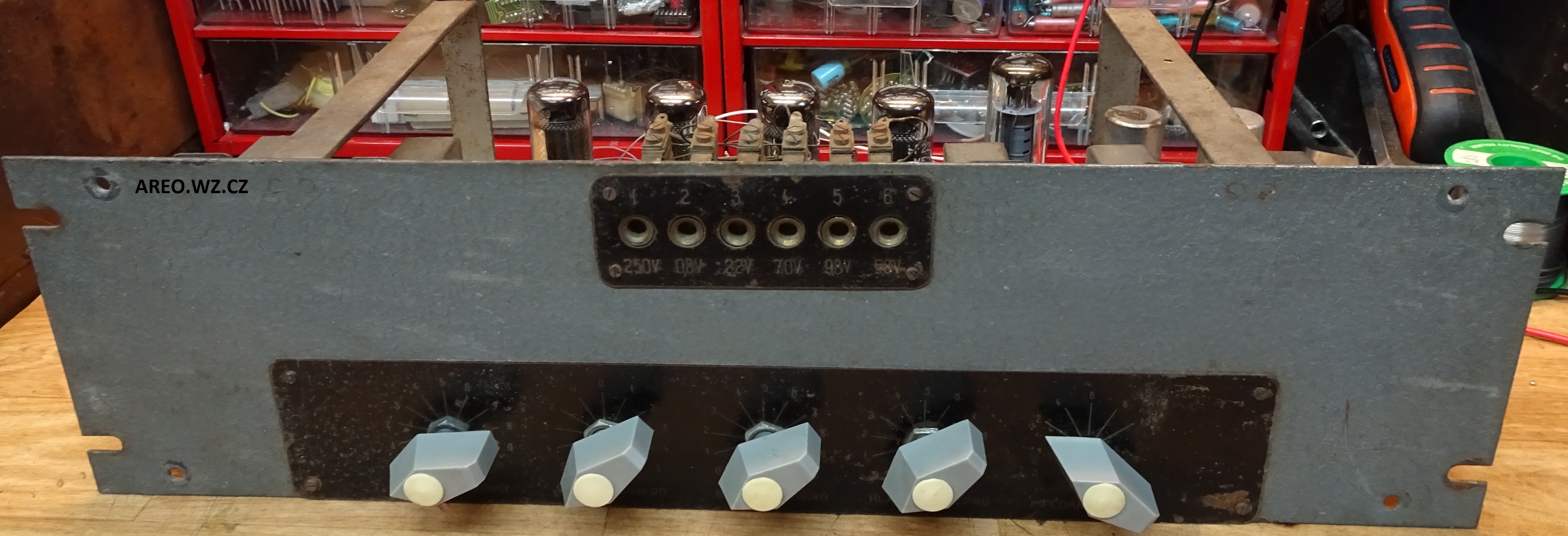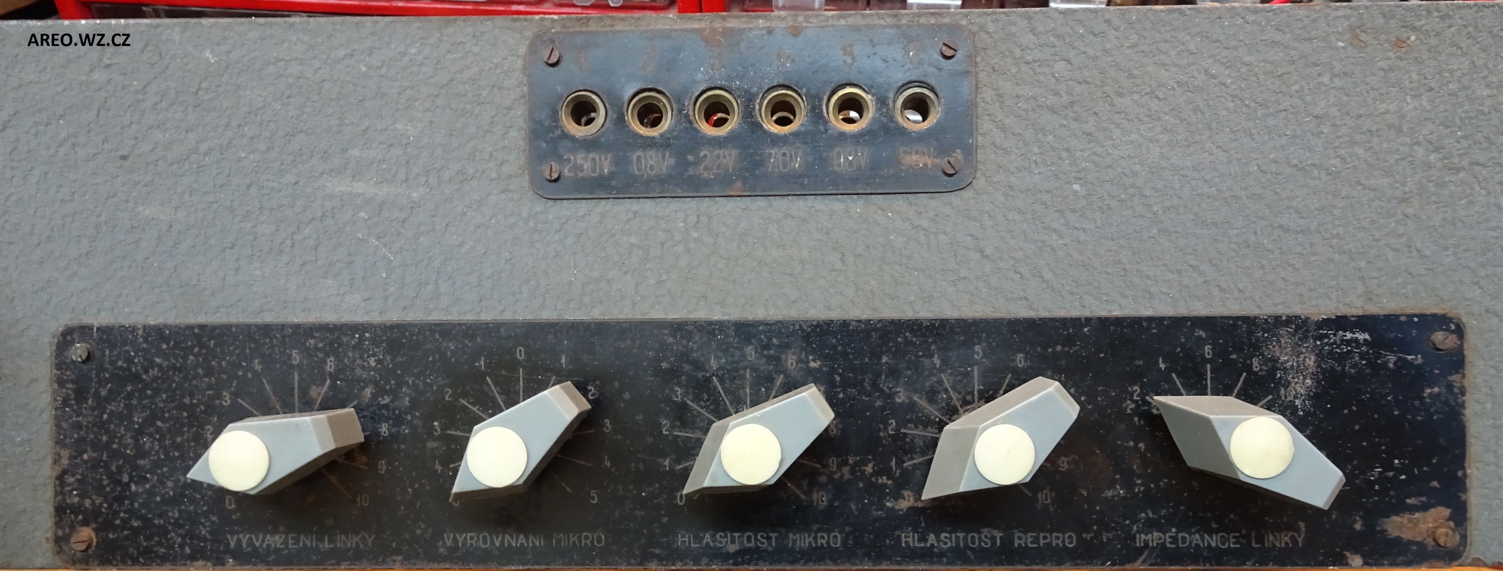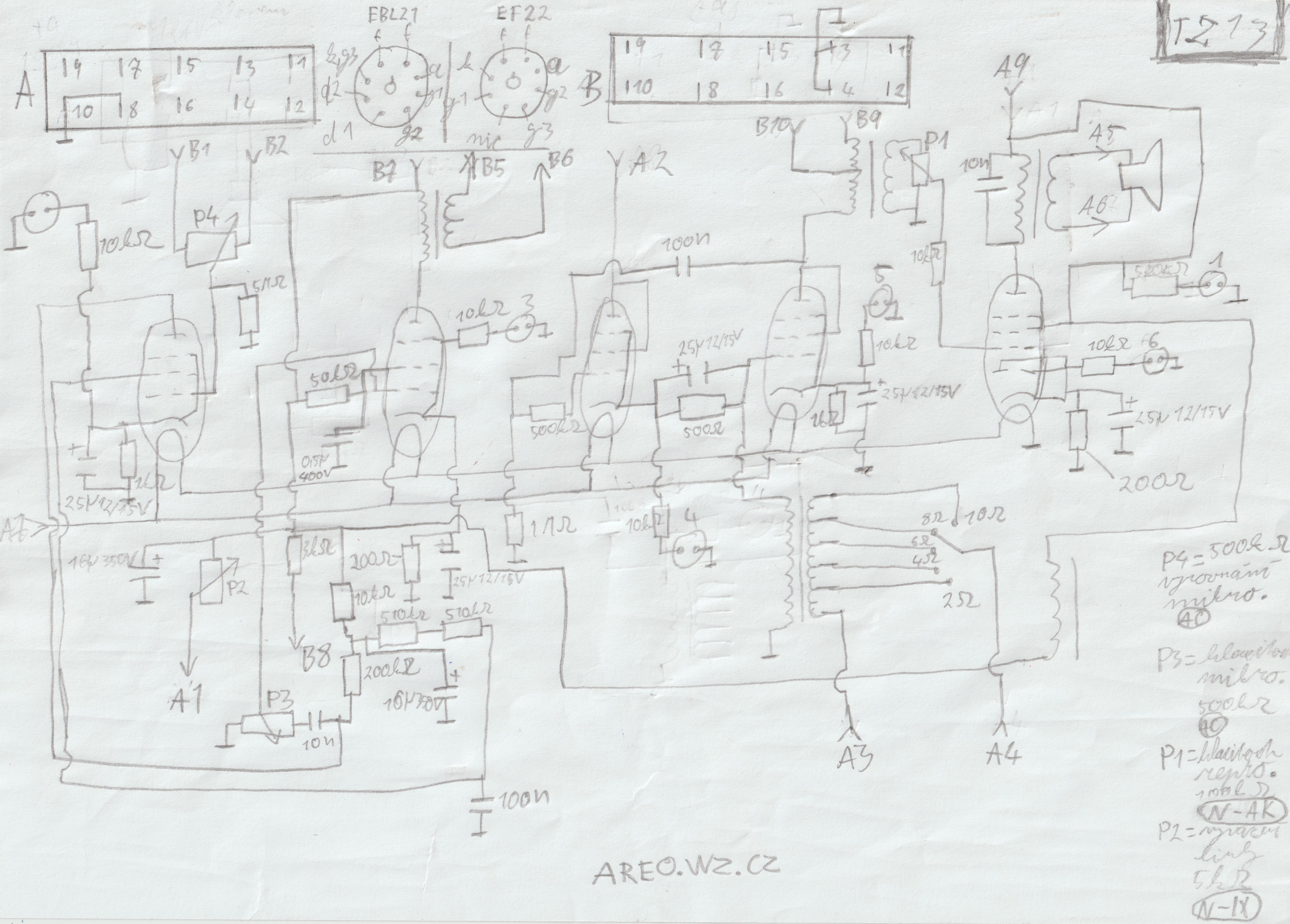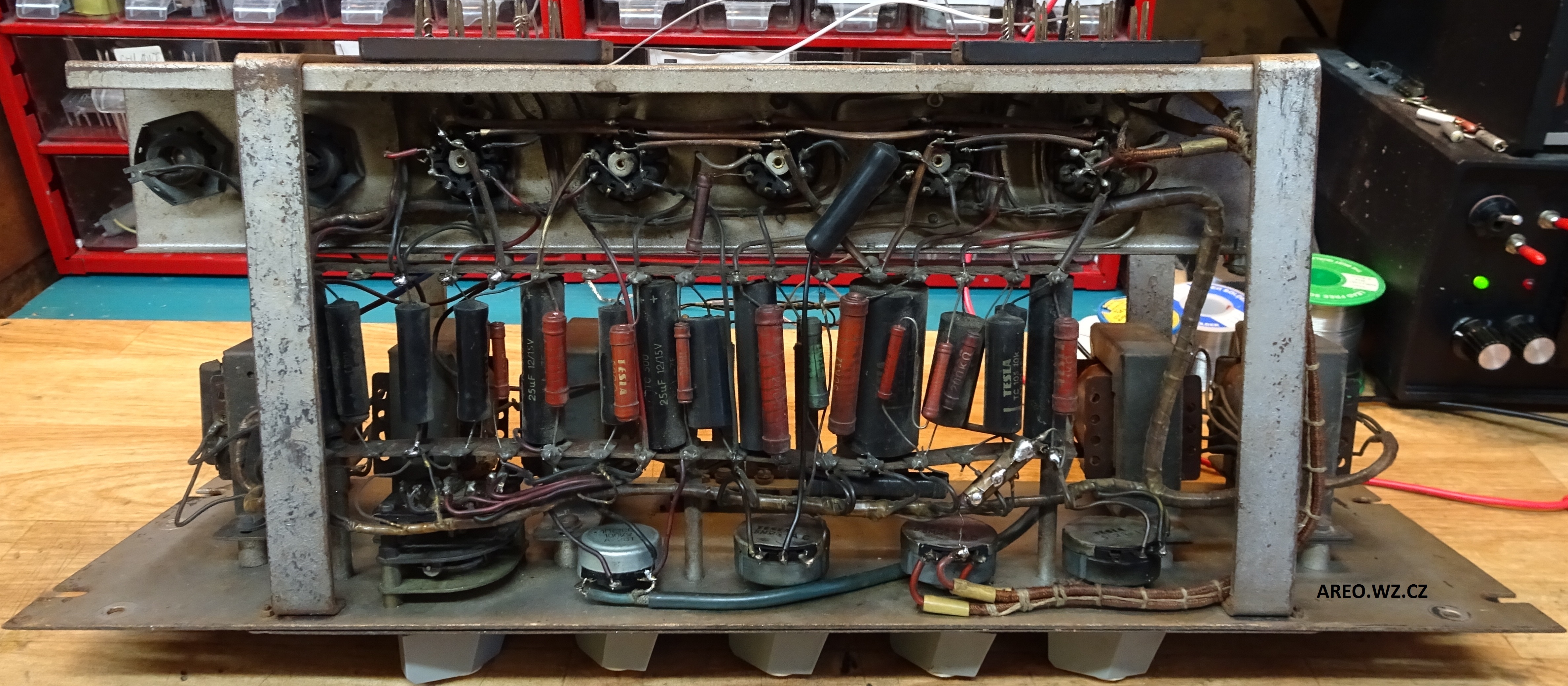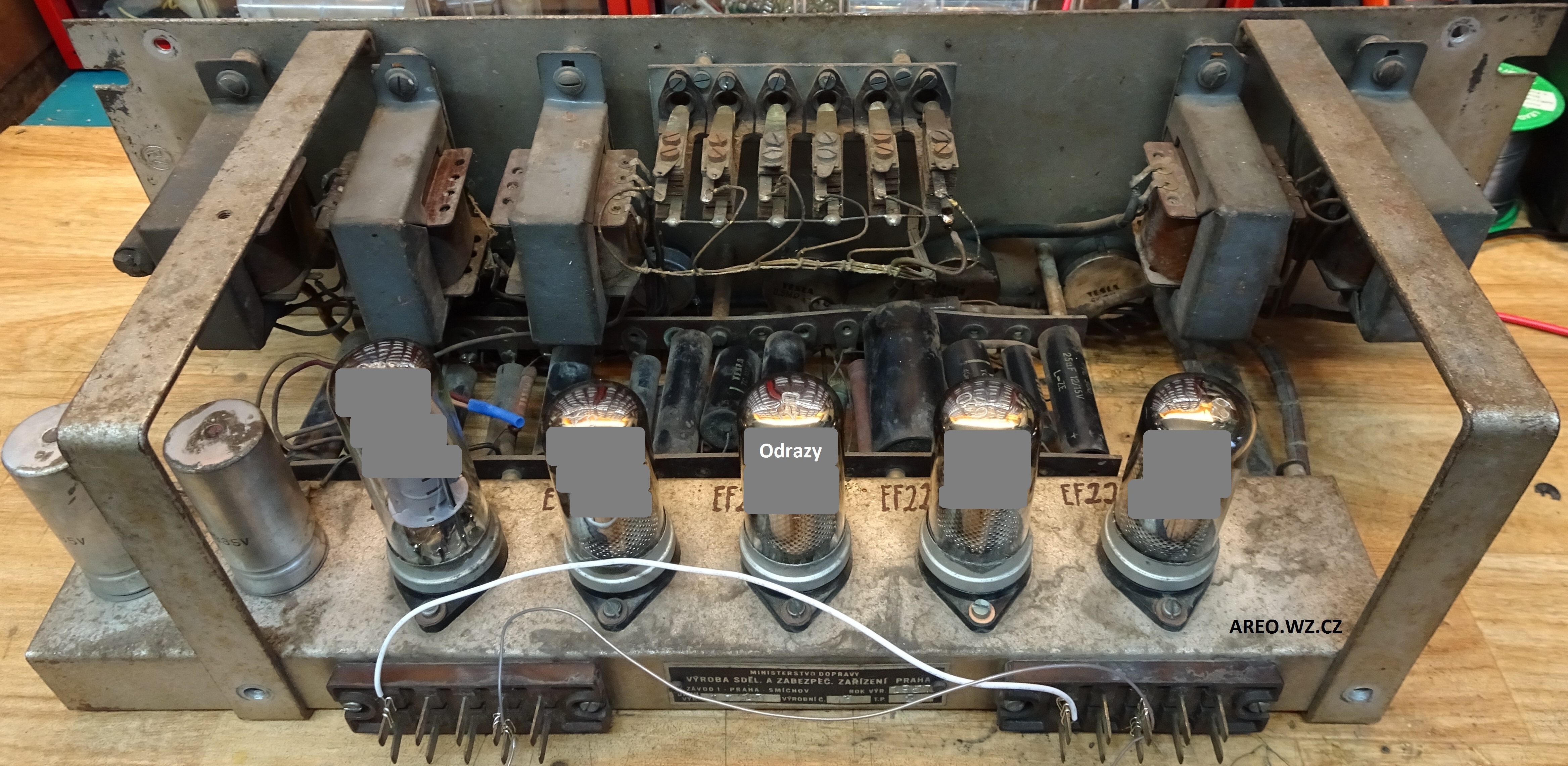 Toto jest prý nádražní zesilovač s jen kontrolním koncovým stupněm. Hlavními obvody tohoto zařízení jsou předzesilovače, dokonce čtyři. Zajímavostí je, že hraje i s původními asfaltovými kondenzátory. Samozřejmě mají pravděpodobně všechny svod a měly by se všechny vyměnit (jen ty asfaltové). Dokumentaci jsem k tomuto zařízení samozřejmě nebyl schopen dohledat, proto jsem mu schéma musel překreslit. Ovládací čudlíky samozřejmě nejsou původní. Nejsem si jist, jestli typ TZ 13 je správný a zda to není IZ 13. Štítek je totiž odbytě vyražen. Ze stejného důvodu výrobní číslo možná není 3, ale 13 (je tam náznak jedničky).