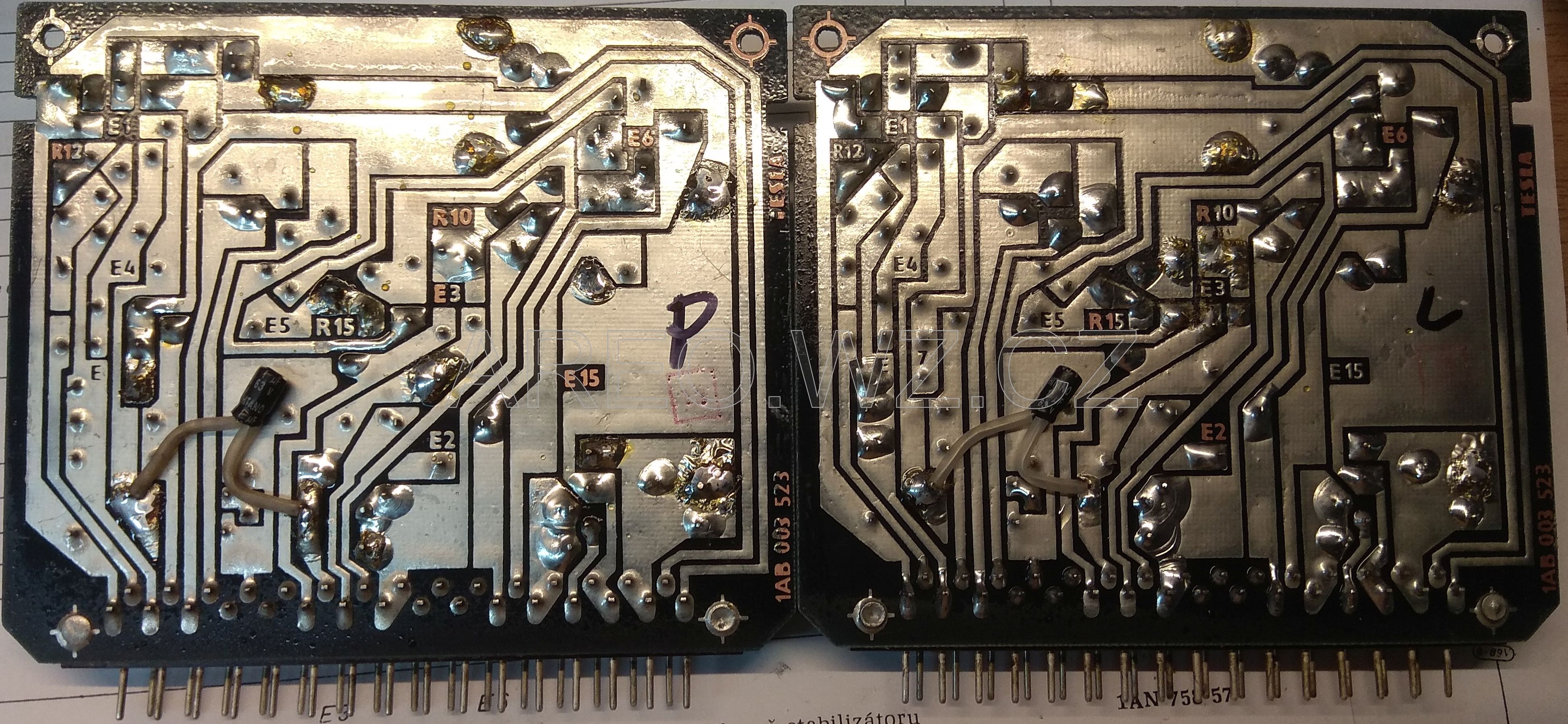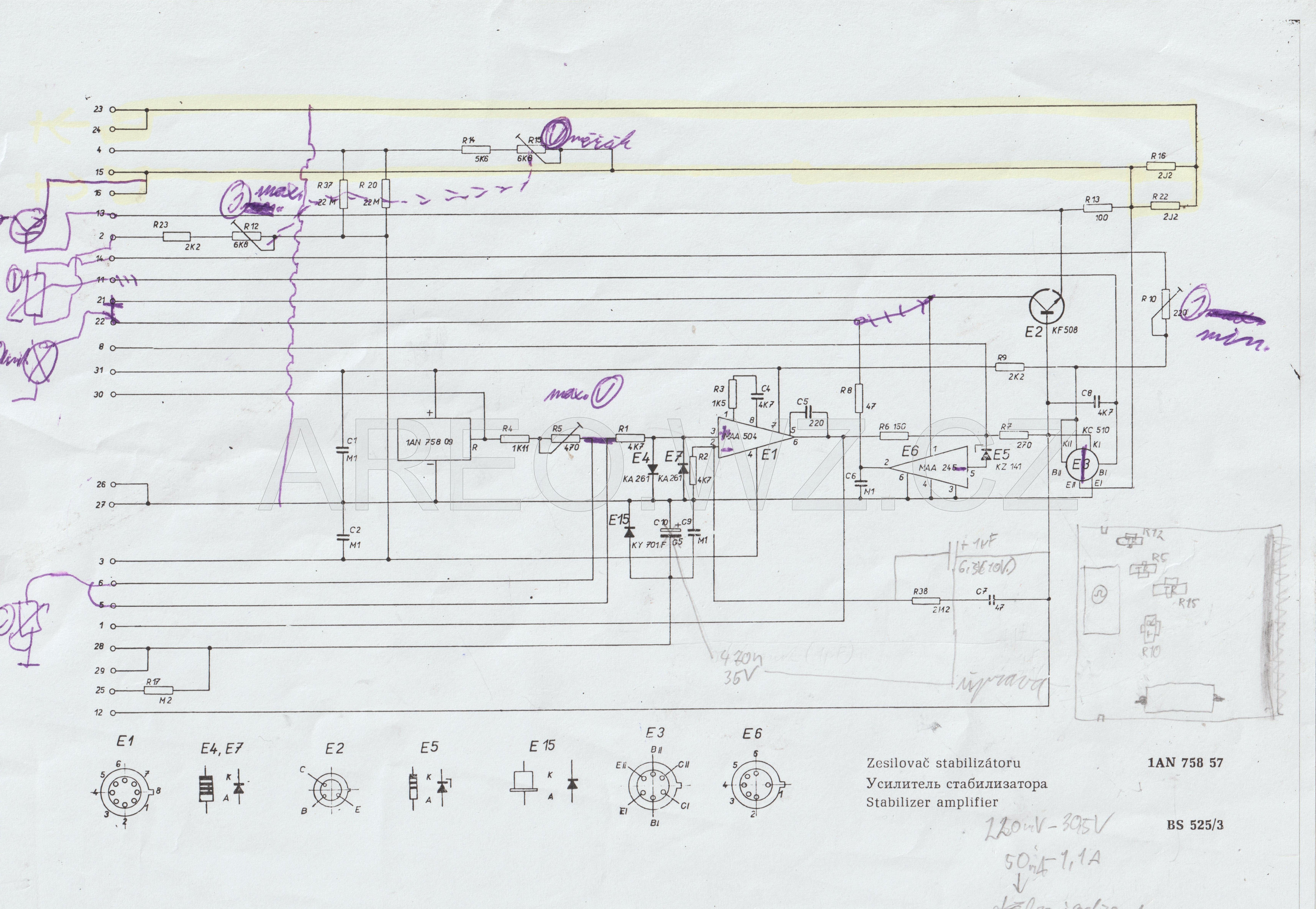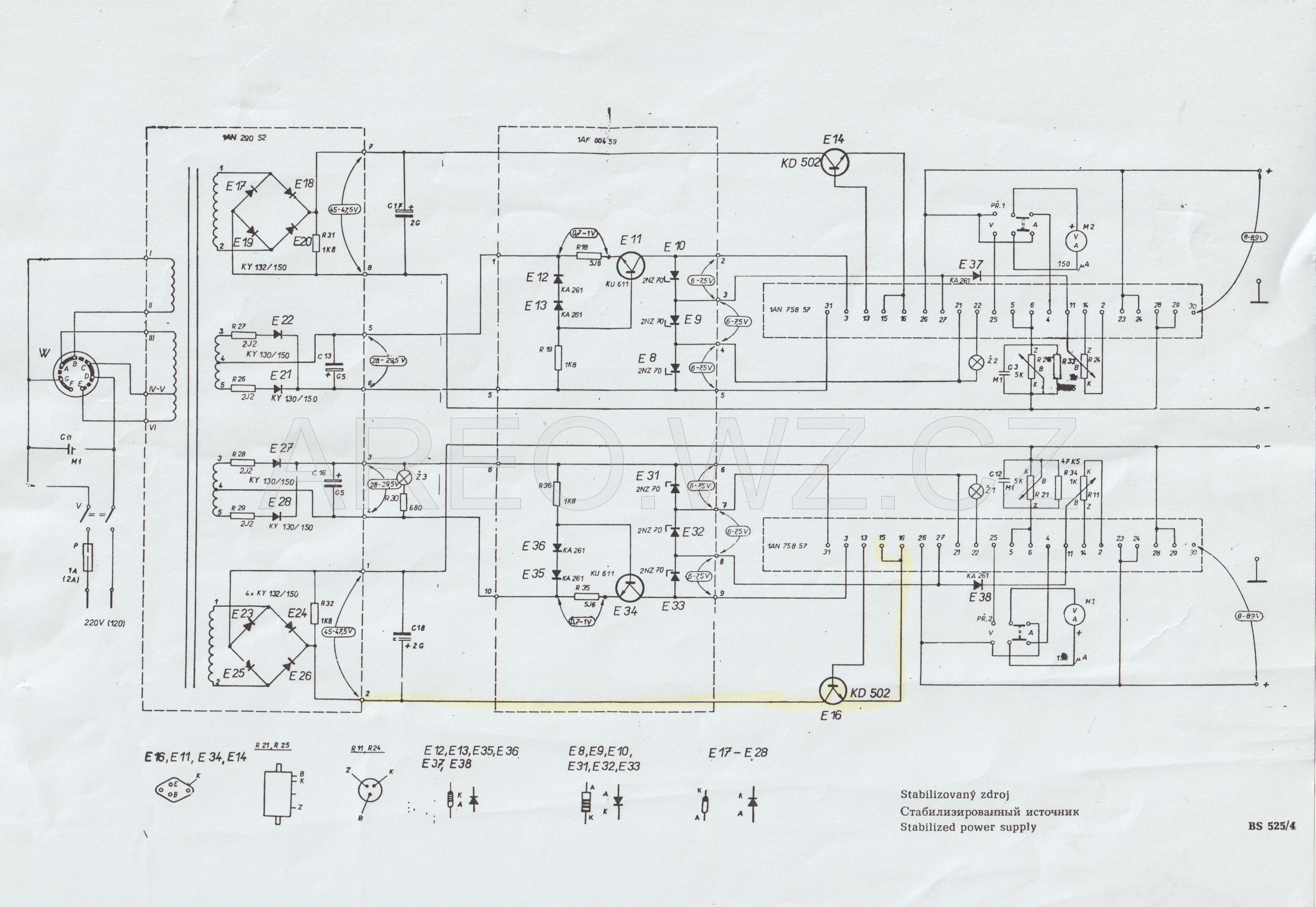 Dvojitý stabilizovaný zdroj TESLA BS 525 je vskutku nepovedený přístroj. Pokud ho neznáte, na schéma jste se ještě nepodívali a zajímá vás proč, tak například proto, že při zkratu na výstupu je asi 30% pravděpodobnost spálení tranzistoru E2 (KF 508). Pokračovat lze tenkými zvonkovými dráty, jimiž jsou připojené výstupní tranzistory k nap. U a k výstupu, nebo kondenzátorem 500uF!!! přímo na výstupu, aby se připojené zařízení na zdroj při poruše spolehlivě zničilo. Úprava je velice jednoduchá. Je hrozné, že takto nedoladěný přístroj šel do výroby. To je podobné, jako s magnetofonem B73, který původně od výroby nemá možnost měření nahrávané úrovně. Ještě dodatek: kondenzátor 1uF je pravděpodobně zbytečně vysoká kapacita, avšak na menší jsem to netestoval na stabilitu, takže neručím, že se to nerozkmitá. A tento pekelný zdroj rád kmitá (asi proto tam dali 0,5mF na výstup, poněvadž se jim to již nechtělo dělat pořádněji. Samozřejmě nejlepší by bylo tu elektroniku udělat zcela jinak a lépe (celé to předělat), ale toto je mnohem rychlejší.