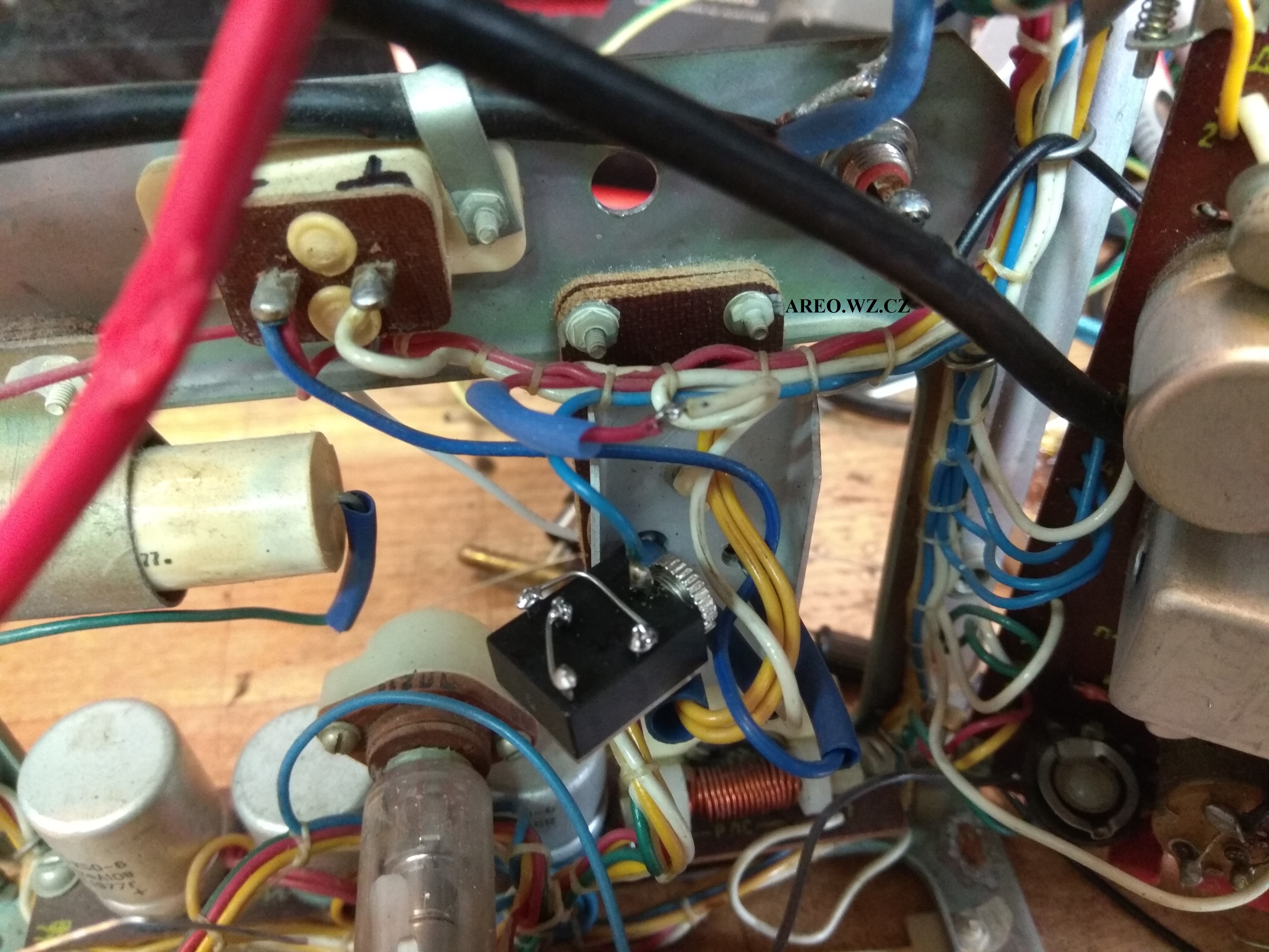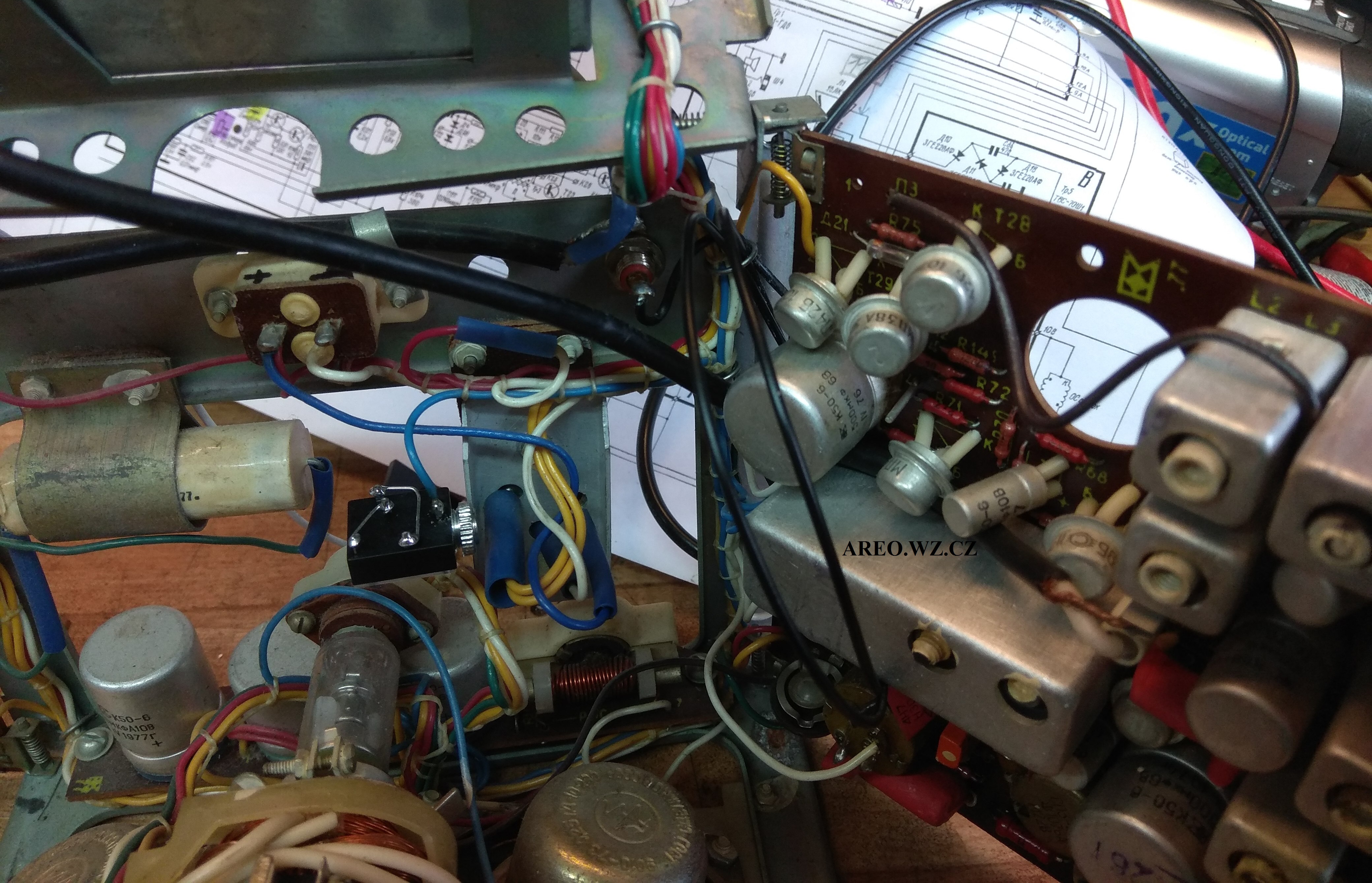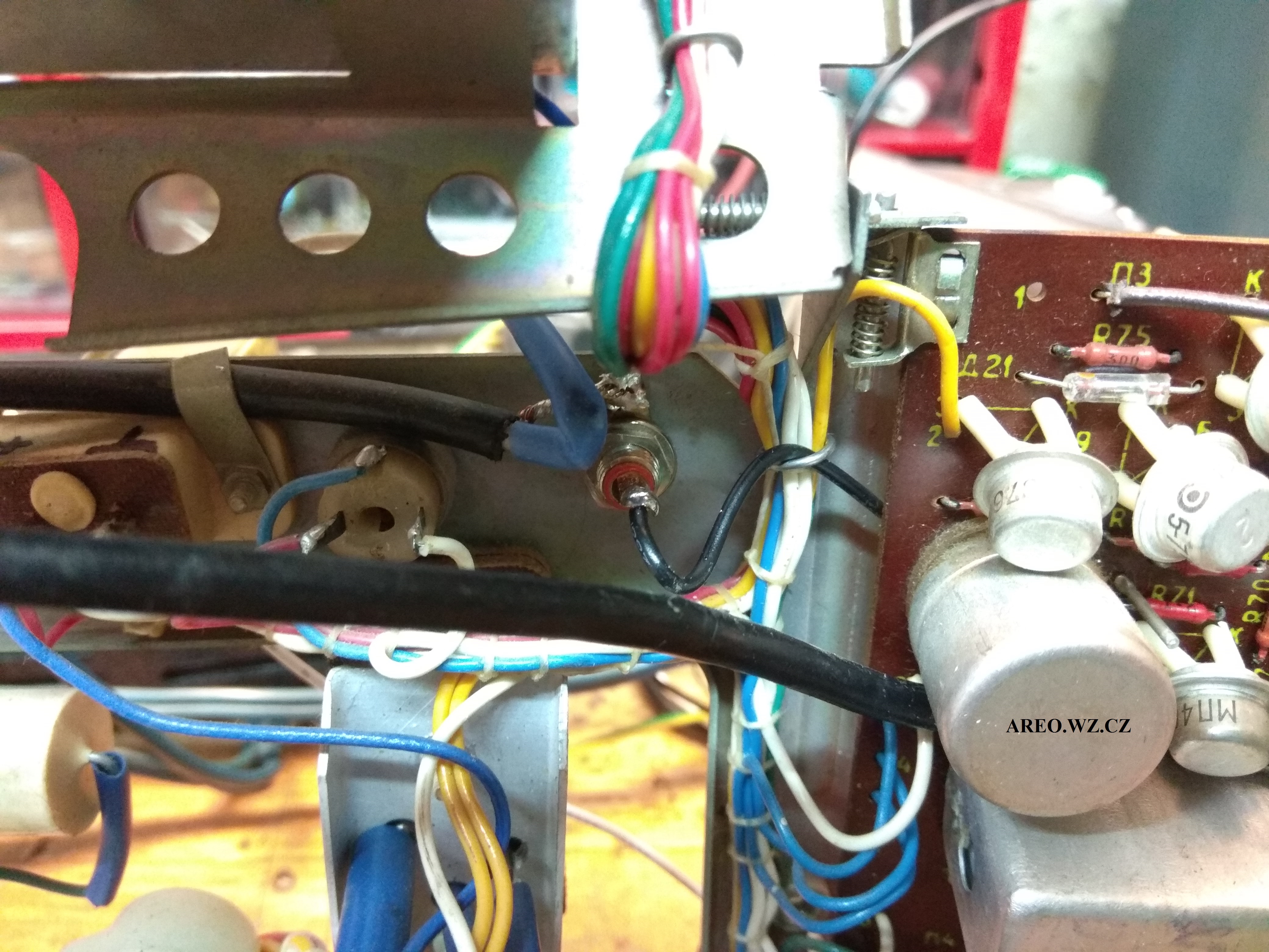 Po úpravě bude možné do televizoru pustit standardní PAL kompozitní video a linkový zvuk. Jako vstup obrazu slouží RCA konektor a jako zvukový vstup je použit Jack 3,2mm s odpojováním kontaktů. Ve schématu je přepínač konektoru zakreslen ve stavu vypojeného konektoru. Původní zdroj signálu z detektoru se odpojuje, aby jeho šum nerušil při připojeném externím zvuku. Tento televizní příjmač má po seřízení téměř dokonale ostrý, nádherný obraz. Téměř každý kus tohoto přístroje je uvnitř jiný (mám tři a ani jeden není uvnitř stejný) a často neodpovídají přesně (některé téměř vůbec) přiloženému schématu. U tohoto kusu bylo nutno zaměnit odpor R108 za 22k, aby se dala dobře a s rezervou nastavit horizontální frekvence. Byl tam použit odpor 82k, přestože je na chématu uveden jako 91k. Kus na obrázcích jsem opravoval jen minimálně, tedy vyměnil jen jeden kondenzátor (C58), aby byla dobrá vert. linearita. Takže geometrie obrazu není tak dobrá, jak může být, ale přibližuje se tomu (alespoň kvalitou obrazu). Některé zcela vyschlé kondenzátory byly ponechány. Jen tento kus má po zakrytování plechy problém s vertikálními čarami, které tam však byly ještě před úpravou a již jsem je neřešil. Použitý vstupní obraz nebyl sám nejkvalitnější, televizor umí tedy zobrazovat ještě lépe. Tato úprava nijak neomezí původní účel televizoru.