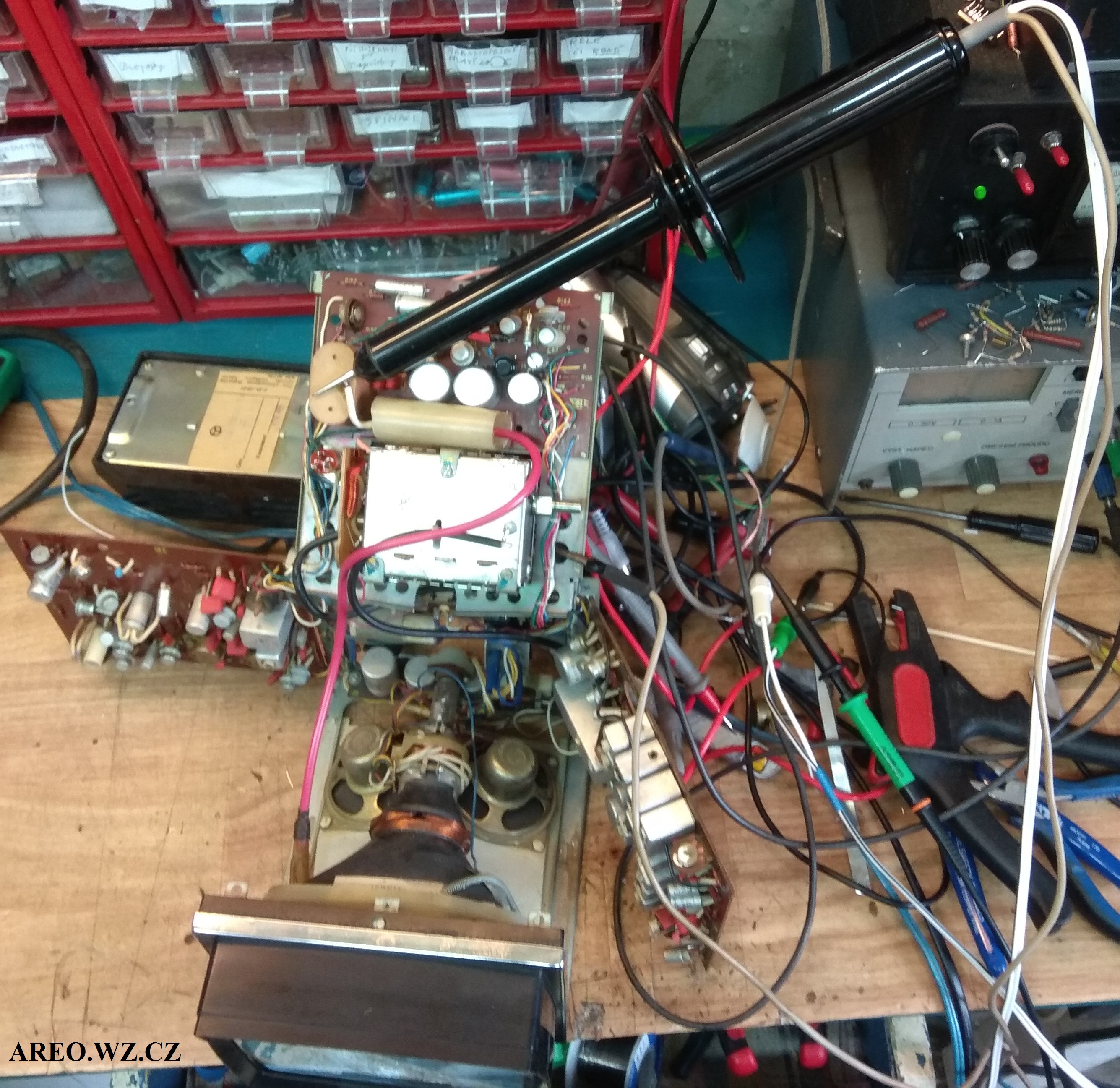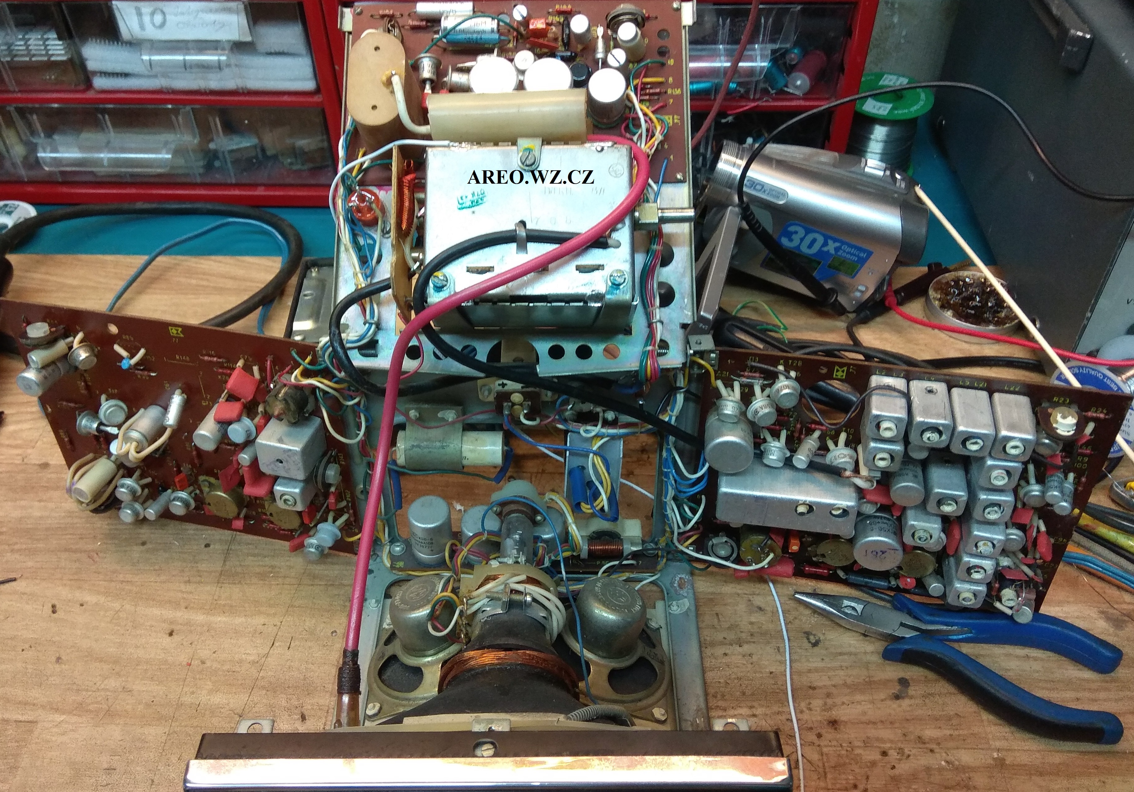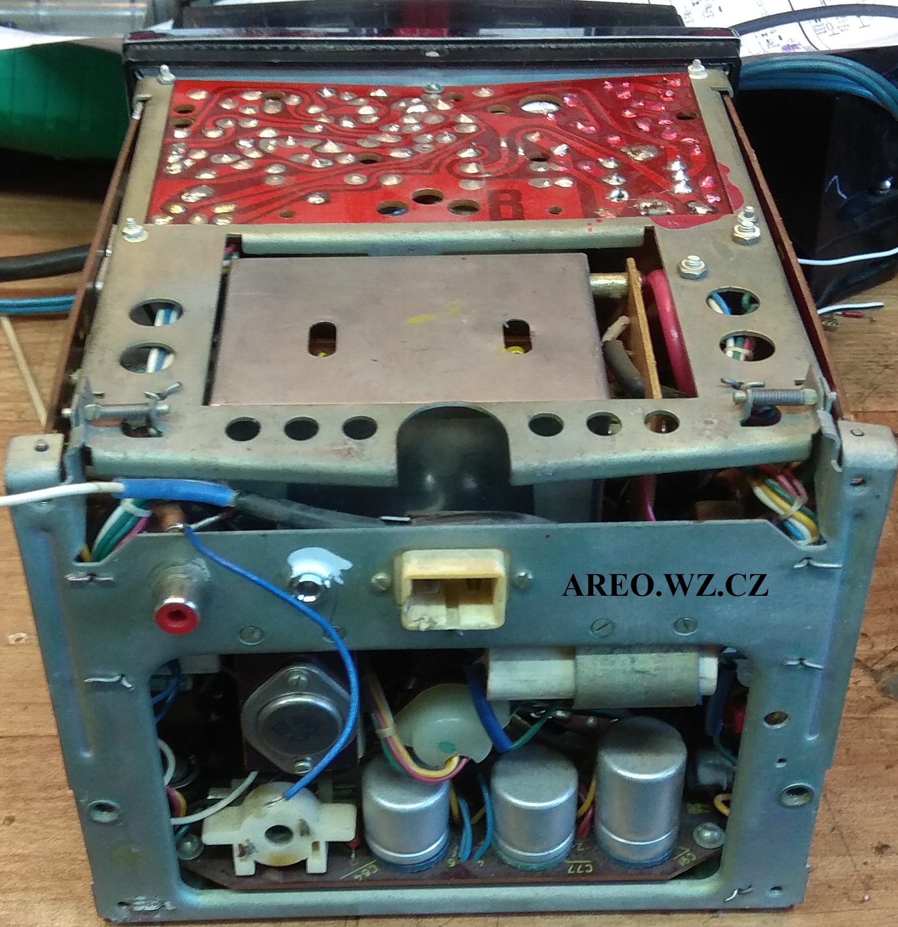 Po úpravě bude možné do televizoru pustit standardní PAL kompozitní video a linkový zvuk. Jako vstup obrazu slouží RCA konektor a jako zvukový vstup je použit Jack 3,2mm s odpojováním kontaktů. Ve schématu je přepínač konektoru zakreslen ve stavu vypojeného konektoru. Původní zdroj signálu z detektoru se odpojuje, aby jeho šum nerušil při připojeném externím zvuku. Tento televizní příjmač má po seřízení téměř dokonale ostrý, nádherný obraz. Téměř každý kus tohoto přístroje je uvnitř jiný (mám tři a ani jeden není uvnitř stejný) a často neodpovídají přesně (některé téměř vůbec) přiloženému schématu. U tohoto kusu bylo nutno zaměnit odpor R108 za 22k, aby se dala dobře a s rezervou nastavit horizontální frekvence. Byl tam použit odpor 82k, přestože je na chématu uveden jako 91k. Kus na obrázcích jsem opravoval jen minimálně, tedy vyměnil jen jeden kondenzátor (C58), aby byla dobrá vert. linearita. Takže geometrie obrazu není tak dobrá, jak může být, ale přibližuje se tomu (alespoň kvalitou obrazu). Některé zcela vyschlé kondenzátory byly ponechány. Jen tento kus má po zakrytování plechy problém s vertikálními čarami, které tam však byly ještě před úpravou a již jsem je neřešil. Použitý vstupní obraz nebyl sám nejkvalitnější, televizor umí tedy zobrazovat ještě lépe. Tato úprava nijak neomezí původní účel televizoru.